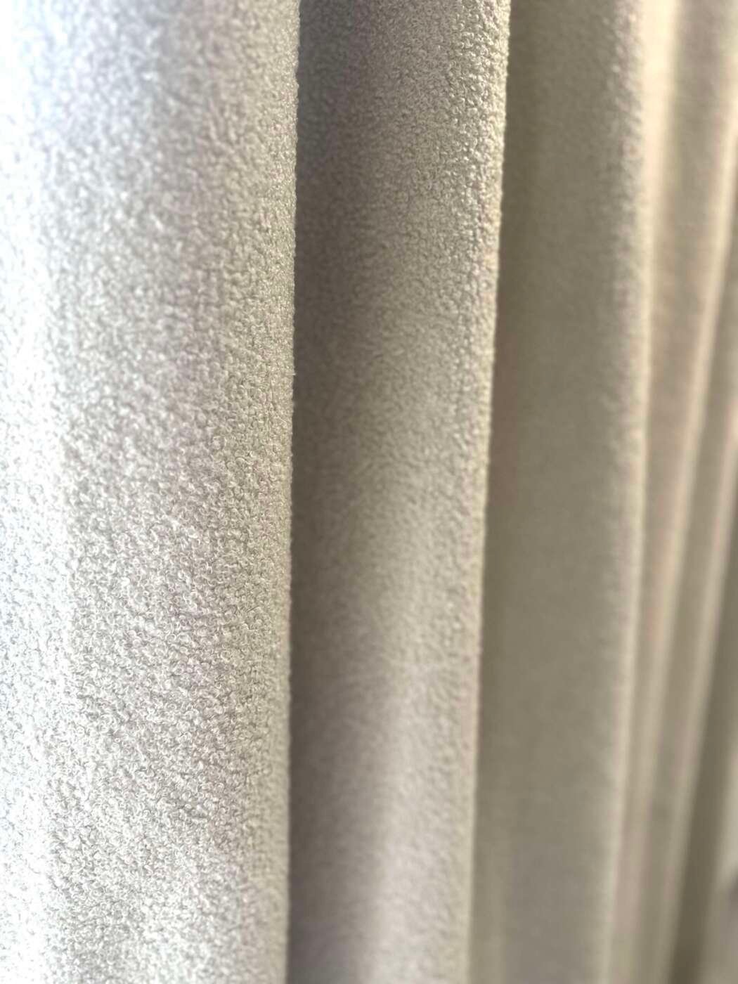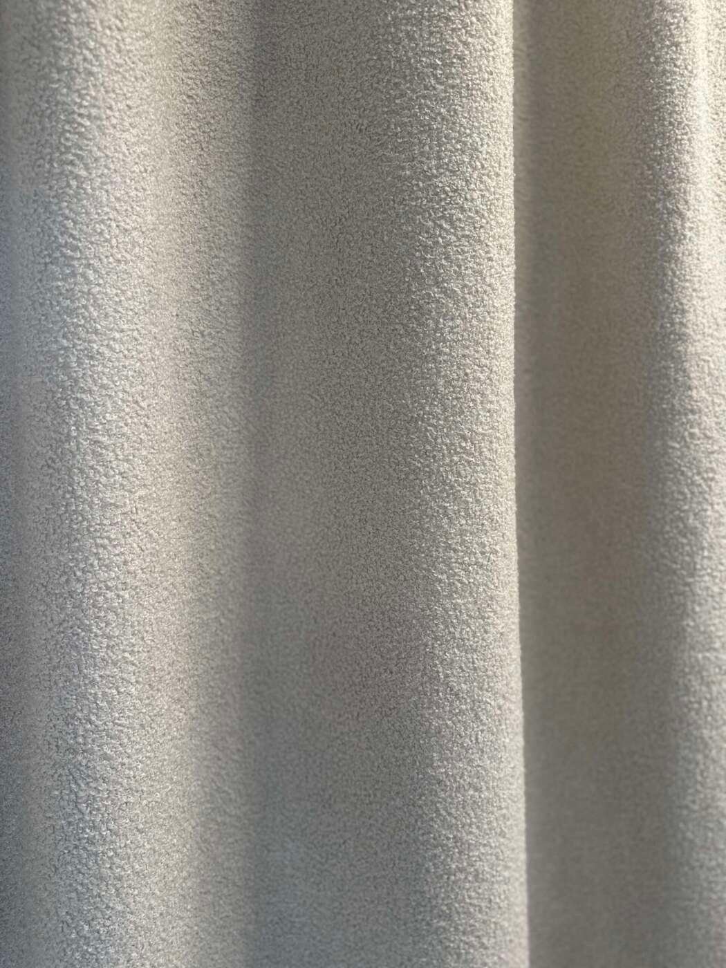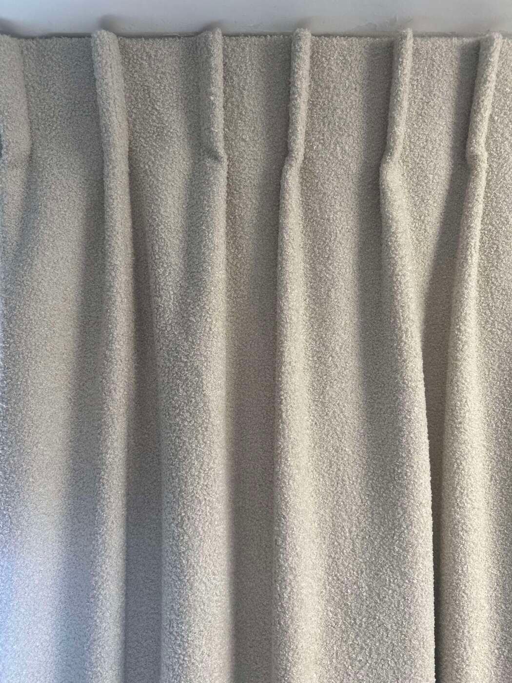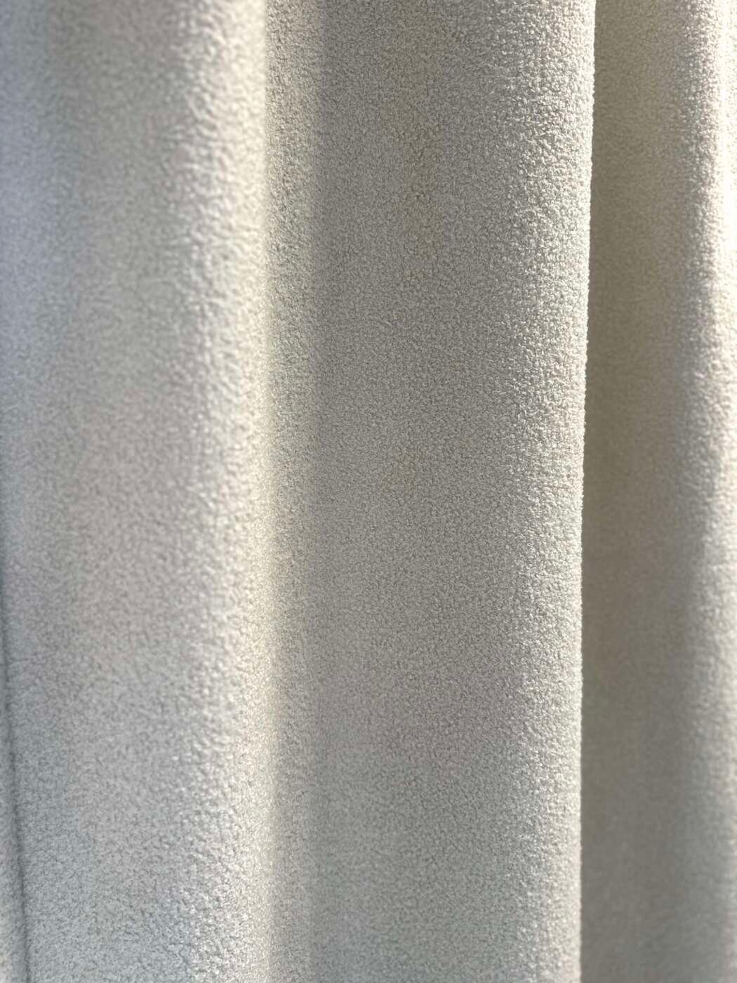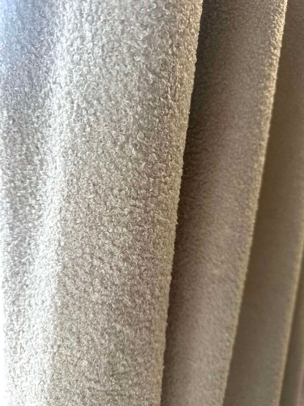 Magnifique rideau tissu Teddy (laine bouclée) au toucher extra doux, à plis flamand de couleur écru, entièrement doublé. Selon les dimensions, avec doublure simple ou avec doublure occultante et thermique.