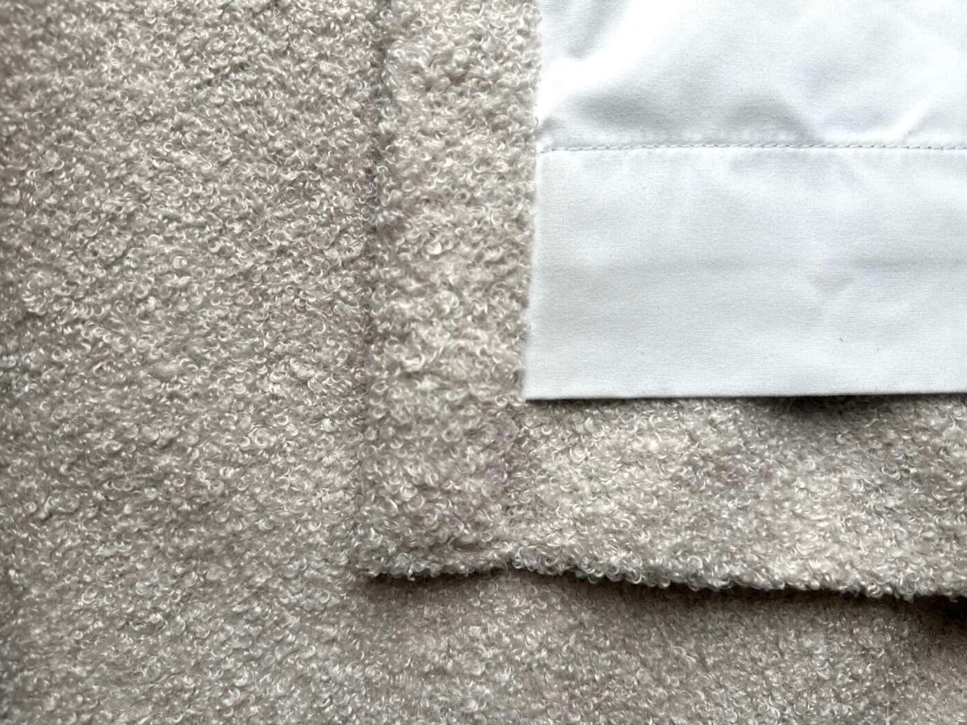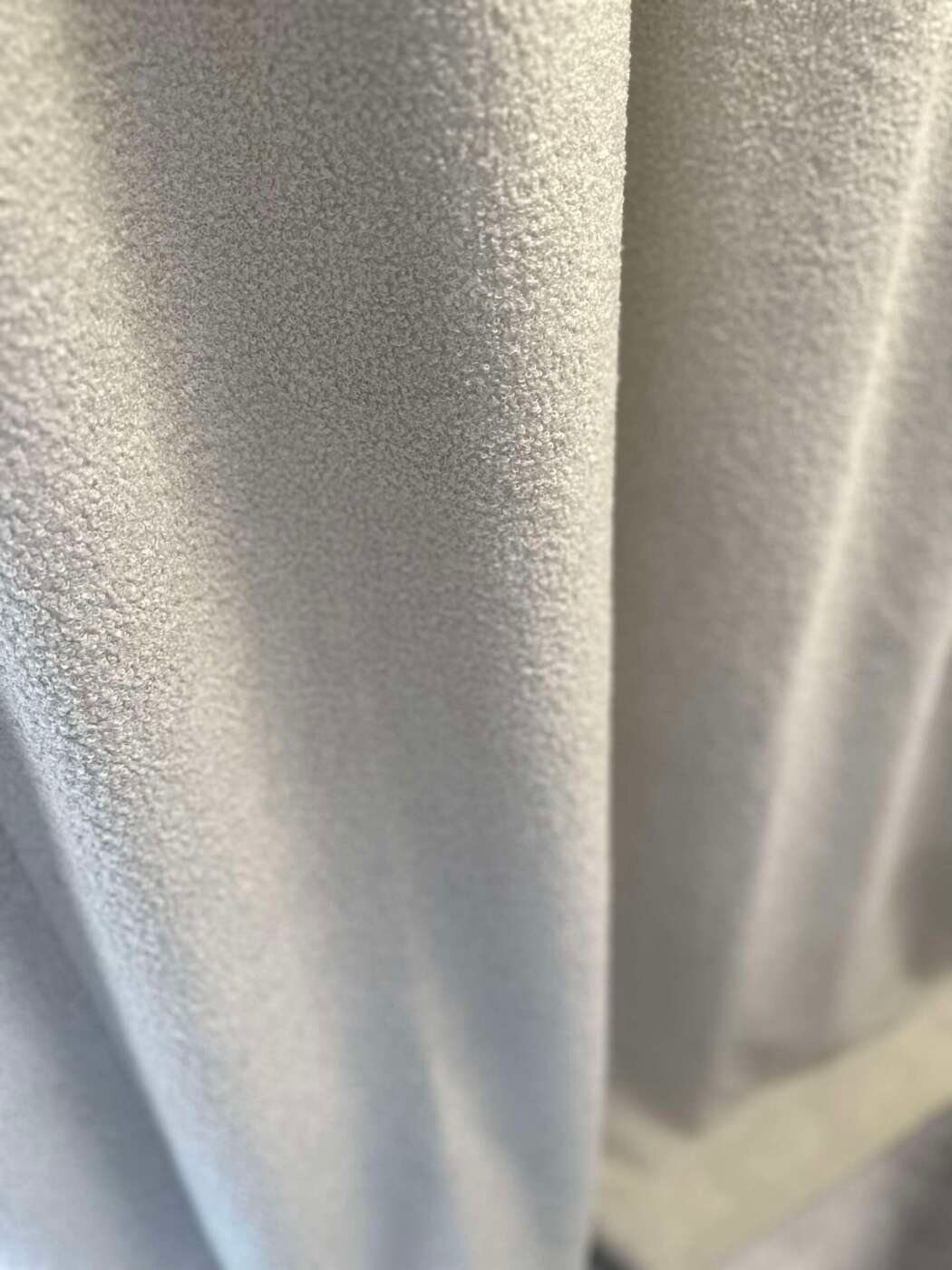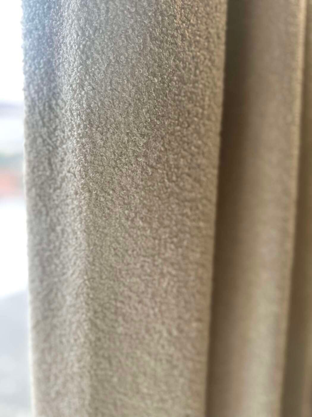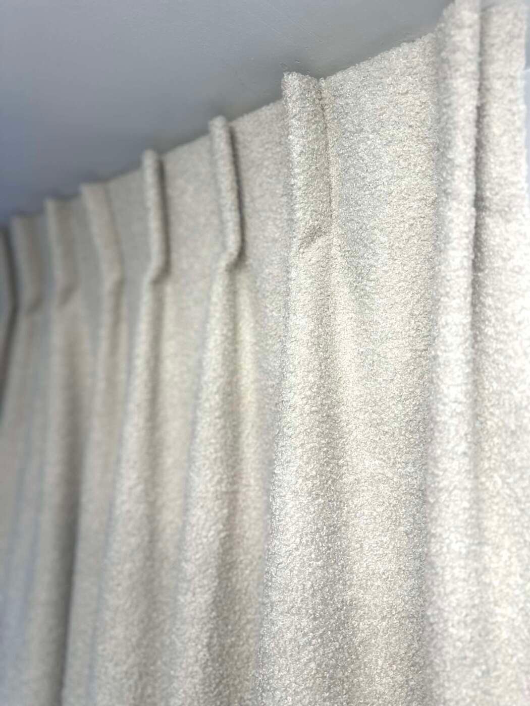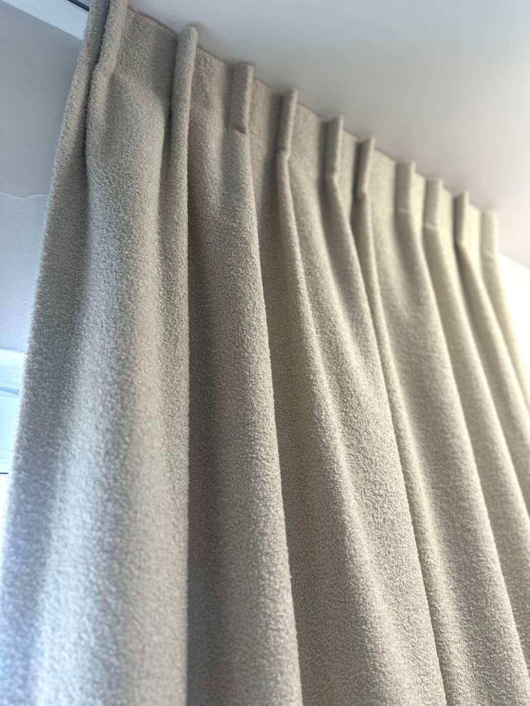 Magnifique rideau tissu Teddy (laine bouclée) au toucher extra doux, à plis flamand de couleur écru, entièrement doublé. Selon les dimensions, avec doublure simple ou avec doublure occultante et thermique.