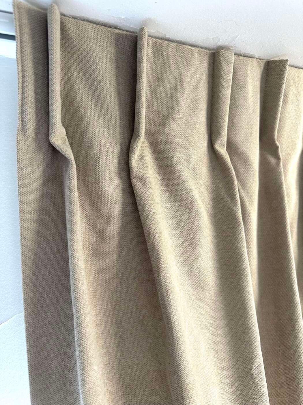 Rideaux Zélie beige à plis flamands. Tissu en velours effet daim, très chaleureux et doux.